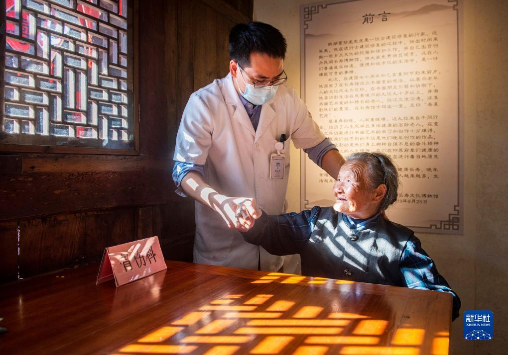 10月21日,浙江省寧波市寧??h中醫院醫療小分隊隊員在梅林街道河洪村的長(cháng)壽文化節活動(dòng)中為老人推拿正骨。