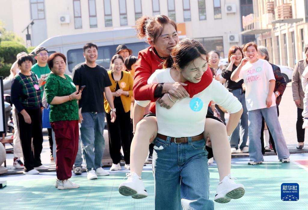 10月21日,在浙江省湖州市德清縣禹越鎮三林村,村民在參加“媳婦背婆婆”趣味游戲。