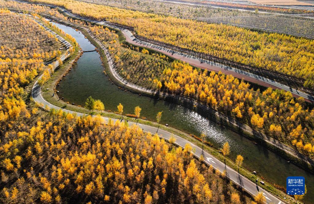 10月21日在甘肅省張掖市甘州區奧林匹克森林公園拍攝的金色的胡楊林(無(wú)人機照片)。