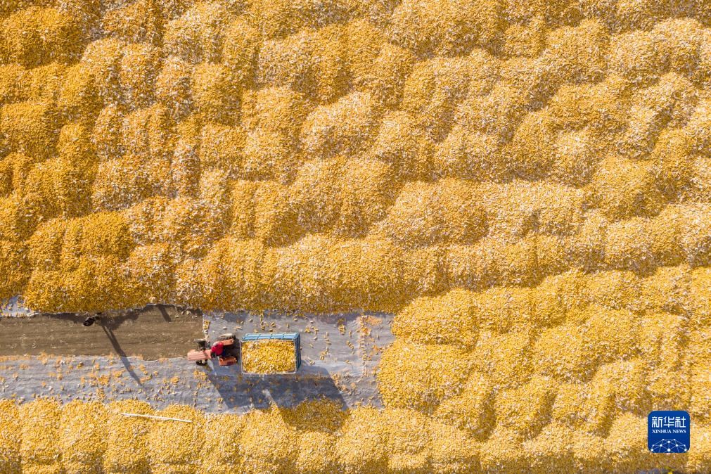 10月19日,在黑龍江省肇東市五里明鎮東升村,農民把收獲的玉米運到當地農業(yè)合作社指定的地點(diǎn)進(jìn)行晾曬(無(wú)人機照片)。