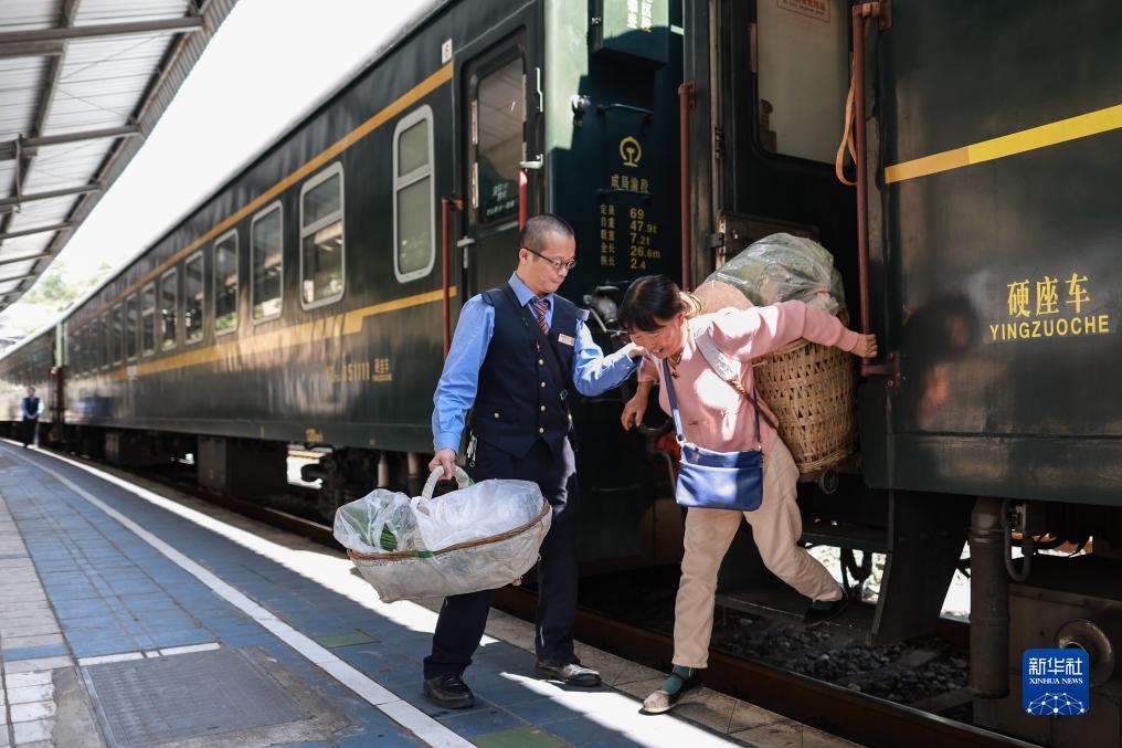 10月17日,5630次列車(chē)到達桐梓站后,村民攜帶農產(chǎn)品下車(chē)。