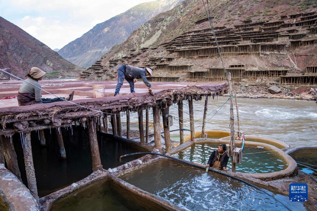 西藏昌都市芒康縣納西民族鄉村民在鹽田里勞作(10月20日攝)。