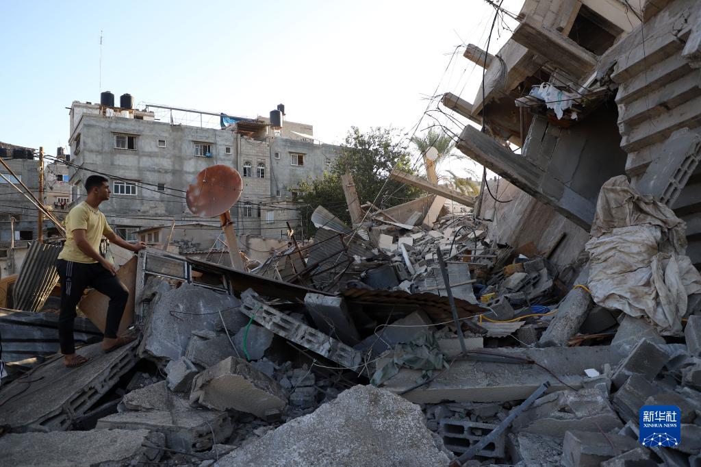 10月21日,在加沙地帶南部城市汗尤尼斯,一名男子站在遭以色列襲擊的建筑廢墟上。
