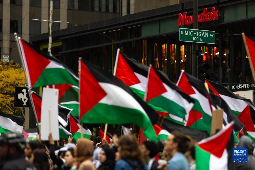10月21日,在美國芝加哥,人們參加聲援巴勒斯坦的游行。