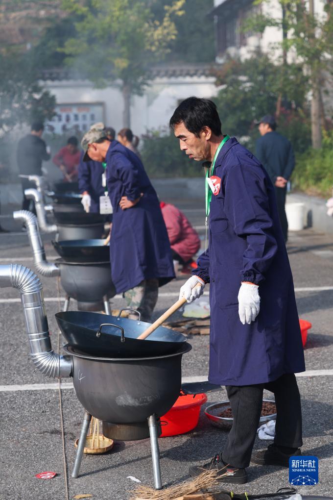 10月22日,參加炒制大賽的香榧種植戶(hù)們正在用鹽炒制香榧。