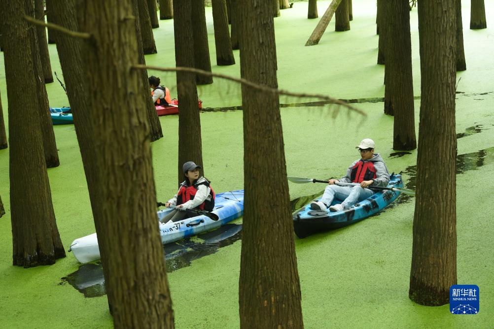 金秋時(shí)節,浙江杭州臨安青山湖近百畝池杉和落羽杉混交林呈現“抹茶森林”景觀(guān),引得大批游客前來(lái)泛舟、漫步觀(guān)光。這片浸沒(méi)于水中的森林每到秋季就會(huì )鋪滿(mǎn)浮萍,浪漫景觀(guān)宛如“綠野仙蹤”。