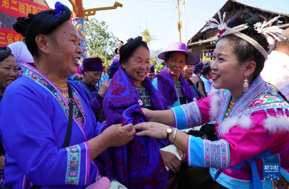 10月21日,在廣西融水苗族自治縣白云鄉龍岑苗寨,外嫁女給老人贈送過(guò)節物品。