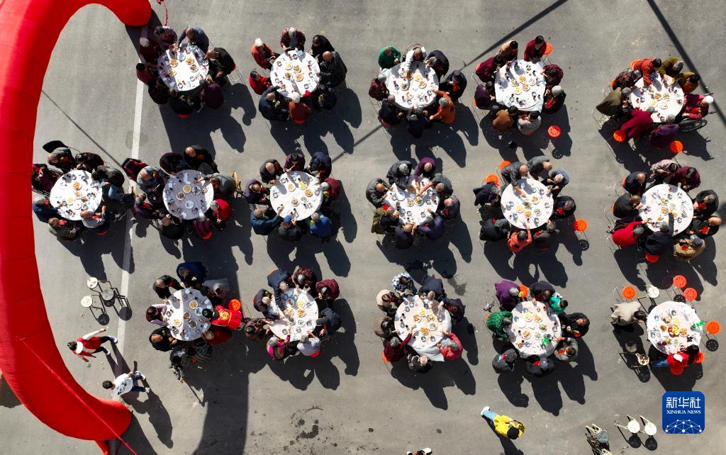10月22日,河南省濟源市軹城鎮良安新村的老人在享用“萬(wàn)壽宴”(無(wú)人機照片)。