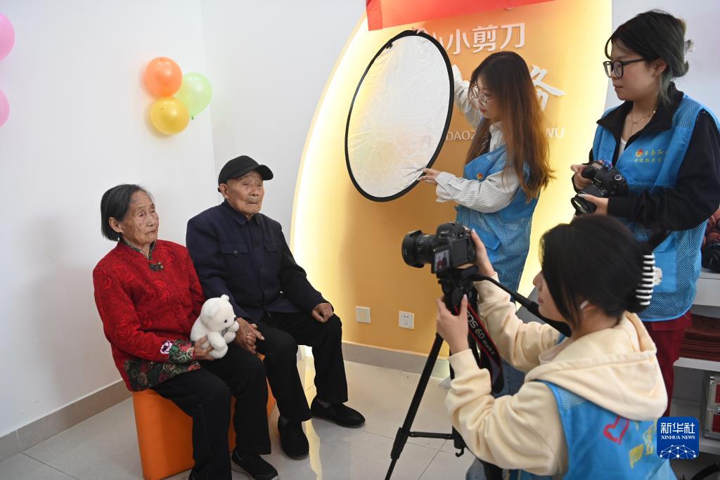10月22日,在山東省聊城市東昌府區閆寺街道鎮南新村,聊城大學(xué)傳媒技術(shù)學(xué)院大學(xué)生志愿者為89歲的秦保平(左二)和88歲的石玉香(左一)拍攝“結婚照”。