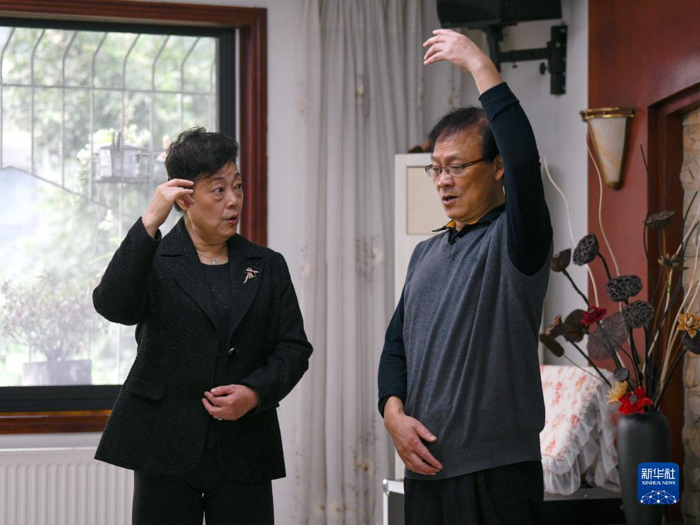 10月21日,鄭義華(左)和丈夫李永東在家練習聲樂(lè )發(fā)聲。