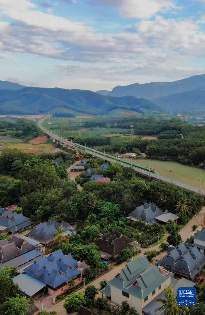 10月18日,在云南省景洪市勐罕鎮,中老鐵路上的動(dòng)車(chē)從傣族村寨旁駛過(guò)(無(wú)人機照片)。