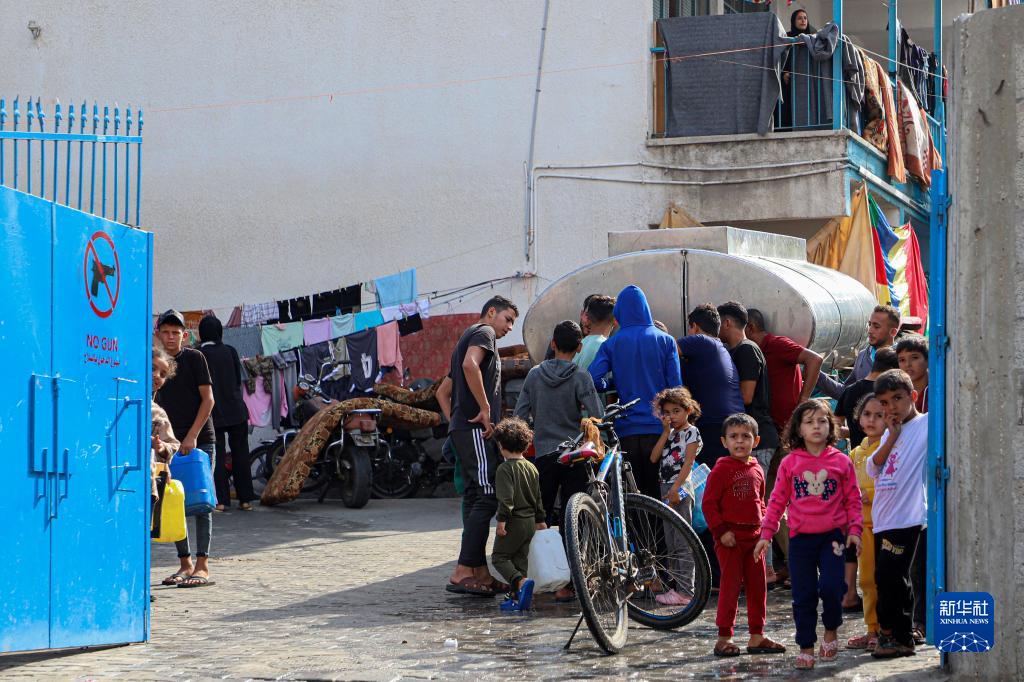 10月22日,兒童在加沙地帶南部城市汗尤尼斯一所臨時(shí)收容學(xué)校內取水。