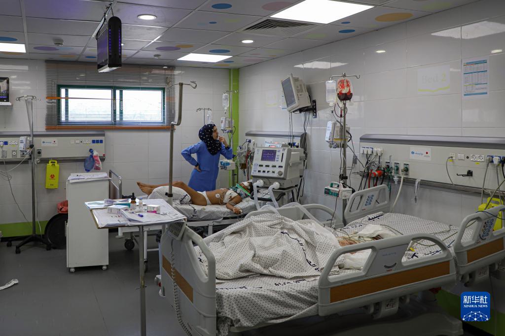 10月22日,在加沙地帶南部城市汗尤尼斯的納賽爾醫院,醫務(wù)人員救治在以色列空襲中受傷的兒童。