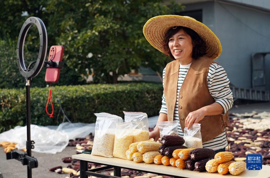在北京市平谷區北臺頭村村委會(huì ),王翠云通過(guò)視頻直播銷(xiāo)售玉米產(chǎn)品(10月23日攝)。