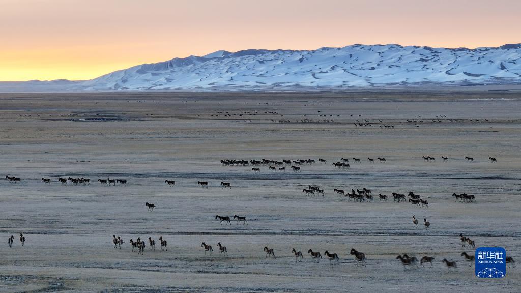 10月17日,在阿爾金山國家級自然保護區,藏野驢在晨光中奔跑(無(wú)人機照片)。
