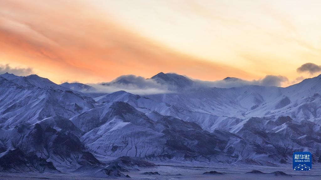 10月17日在阿爾金山國家級自然保護區拍攝的雪山和朝霞(無(wú)人機照片)。