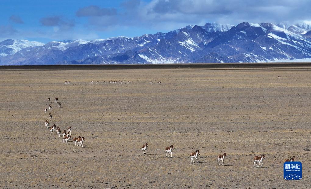 10月17日,在阿爾金山國家級自然保護區,藏野驢在草原上奔跑(無(wú)人機照片)。