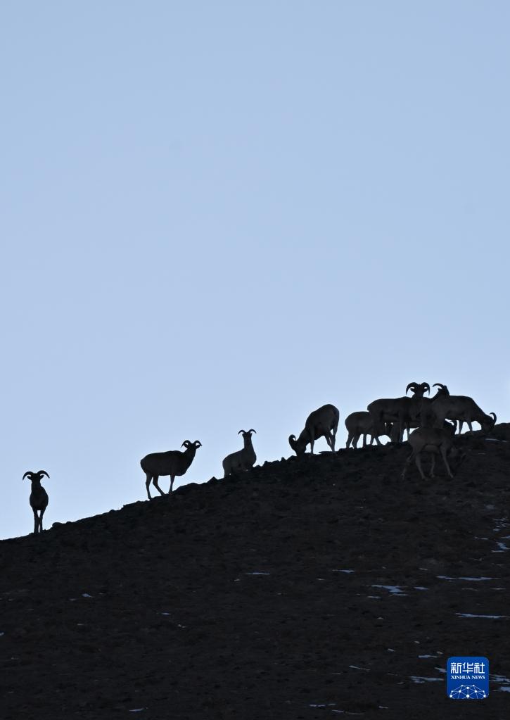 10月15日,在阿爾金山國家級自然保護區,一群巖羊在山坡覓食。