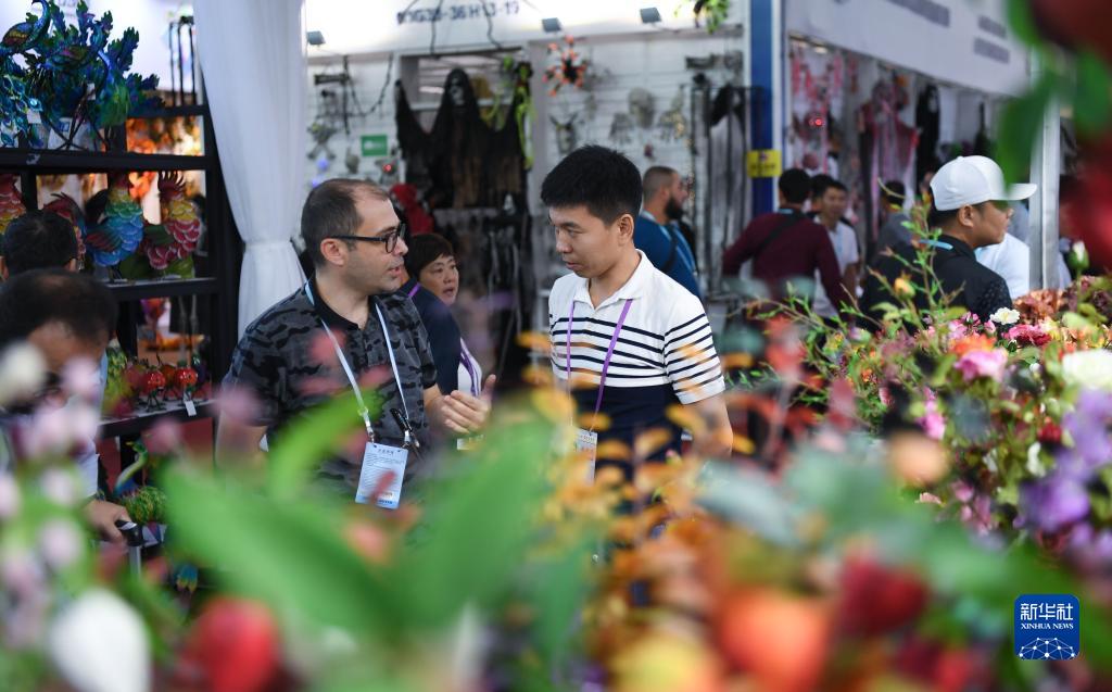 10月23日,外國采購商(左)在仿真花展臺洽談業(yè)務(wù)。
