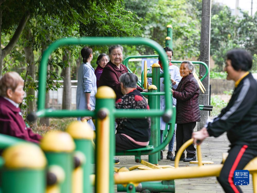 10月20日,在四川省眉山市彭山區社會(huì )福利院,趙鳳章老奶奶(右二)在福利院工作人員陪同下鍛煉身體。