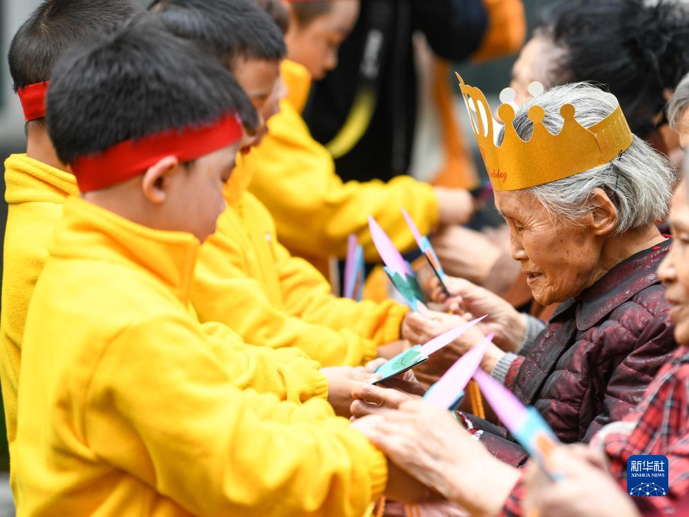 10月20日,在四川省眉山市彭山區社會(huì )福利院,彭山區幼兒園的小朋友為趙鳳章老奶奶送上祝壽賀卡。