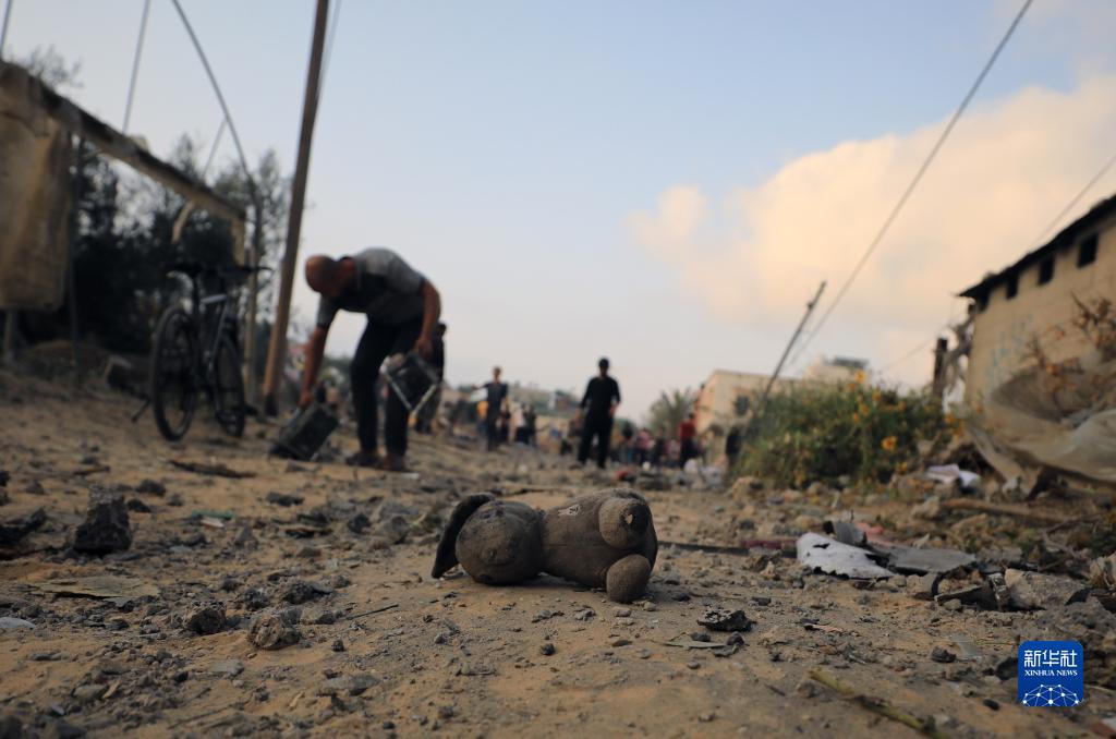 10月23日,人們在加沙地帶南部城市汗尤尼斯查看空襲后的建筑廢墟。