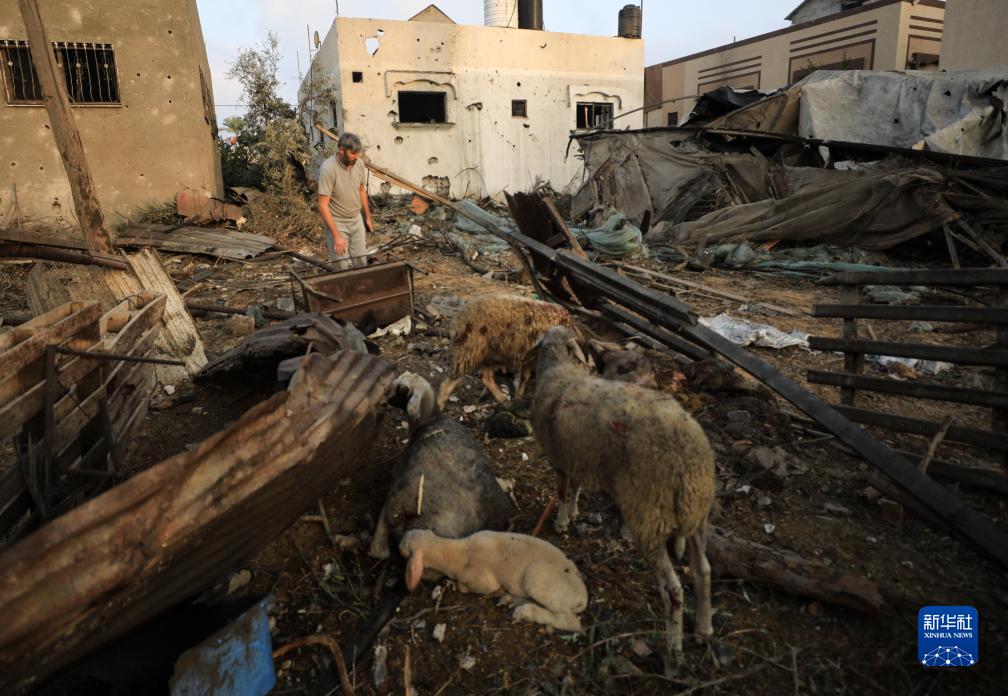 10月23日,一名男子在加沙地帶南部城市汗尤尼斯查看空襲后的建筑廢墟。
