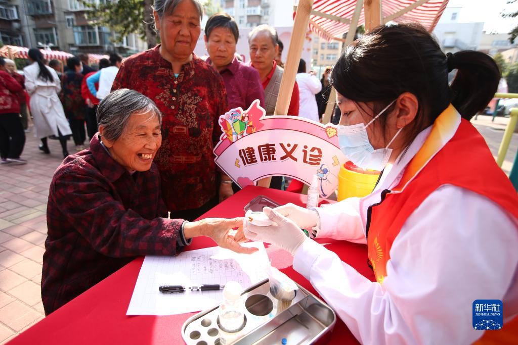 10月23日,在山東省濟南市洪家樓街道洪樓廣場(chǎng)社區,志愿者為老年人開(kāi)展健康義診。
