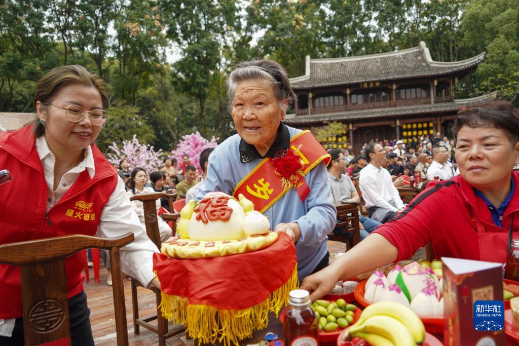 10月23日,在浙江省溫州市鹿城區九山書(shū)會(huì ),志愿者為老壽星送上壽桃。