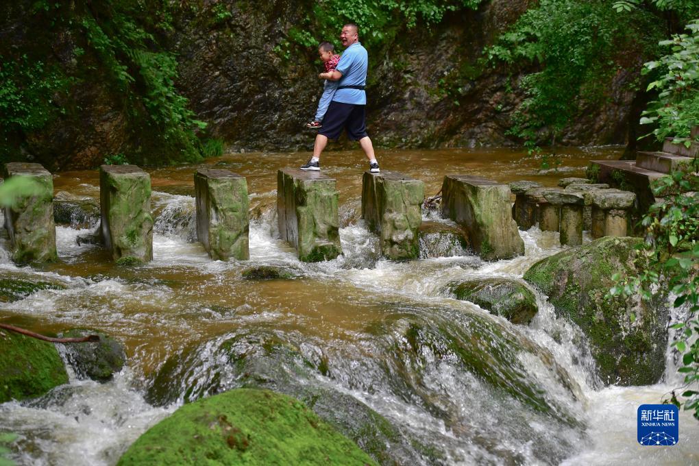 游客在位于朱家灣村的牛背梁國家森林公園內游玩(2020年7月22日攝)。