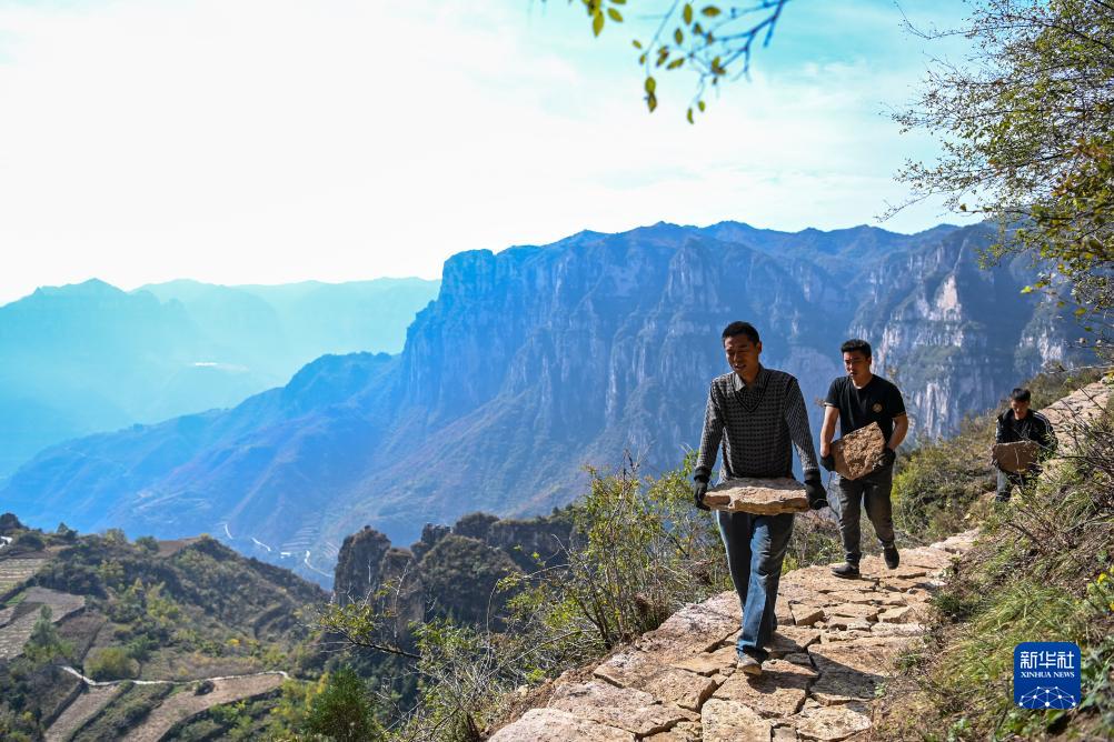 在壺關(guān)縣大峽谷鎮青龍峽村,牛何松(左)和村民們在山間搬運石塊(10月17日攝)。