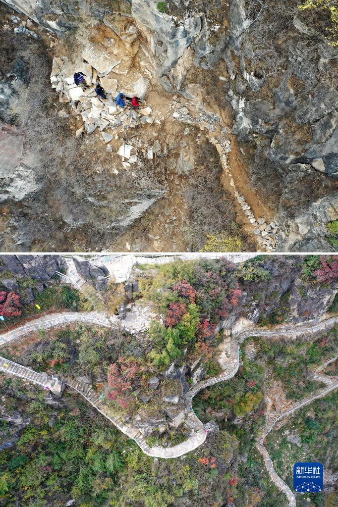 拼版照片:上圖為在壺關(guān)縣大峽谷鎮青龍峽村,村民們在山上修路(3月23日攝,無(wú)人機照片);下圖為修好的旅游步道(10月18日攝,無(wú)人機照片)。