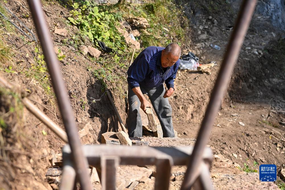 村民王成生在山上搬運石塊(10月17日攝)。