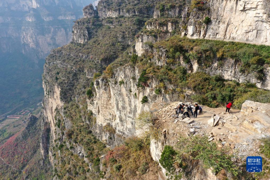 村民們在山上修路(10月17日攝,無(wú)人機照片)。