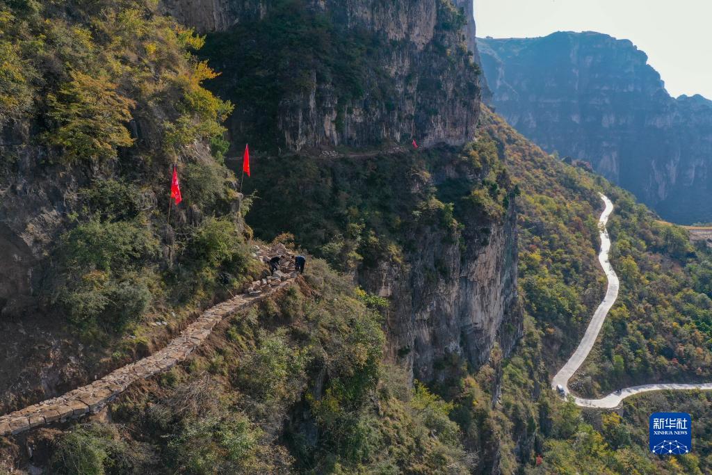 村民在太行山上修路(10月18日攝,無(wú)人機照片)。