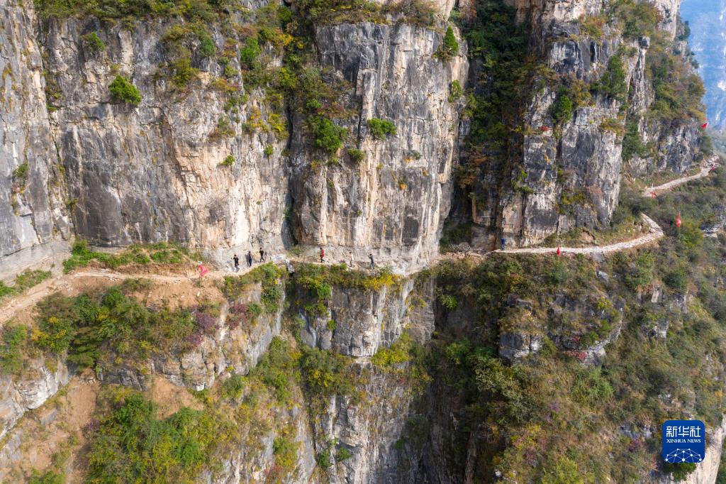 在壺關(guān)縣大峽谷鎮青龍峽村,修路的村民在太行山上行走(10月17日攝,無(wú)人機照片)。