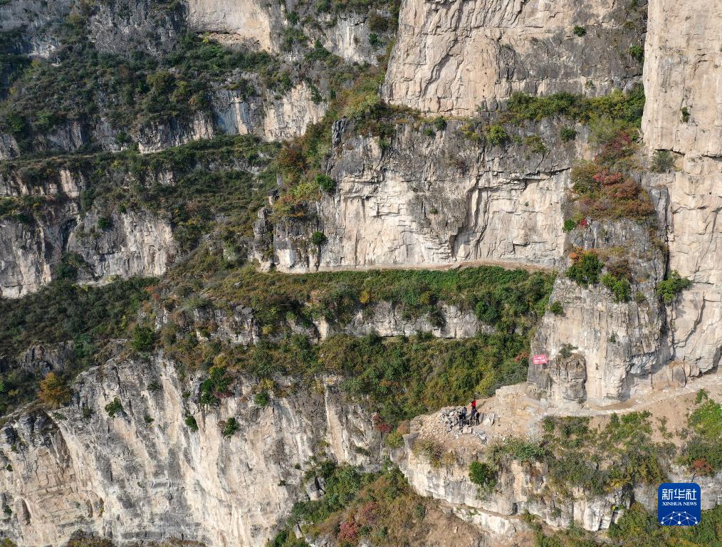 在壺關(guān)縣大峽谷鎮青龍峽村,村民們在山上修路(10月17日攝,無(wú)人機照片)。