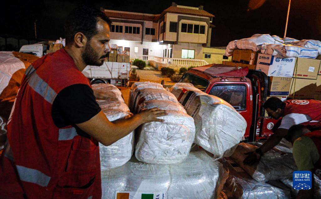 10月23日,在埃及阿里什市一處倉庫,埃及紅新月會(huì )的工作人員搬運救援物資。