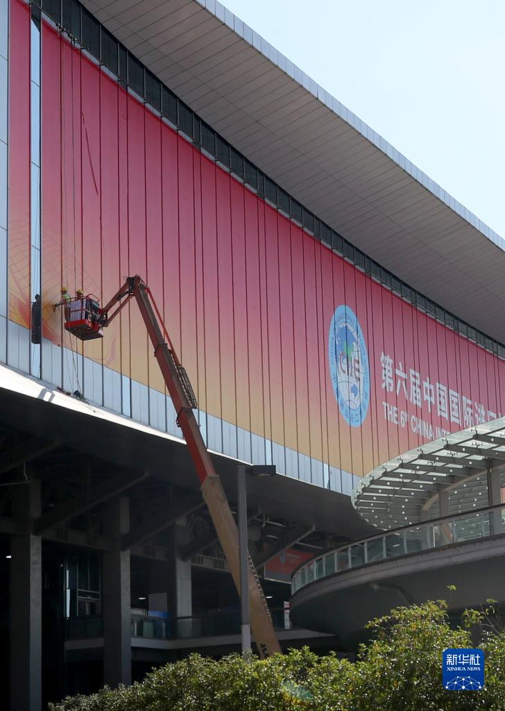 10月24日,施工人員在國家會(huì )展中心(上海)西入口外張貼進(jìn)博會(huì )主題外立面裝飾貼紙。