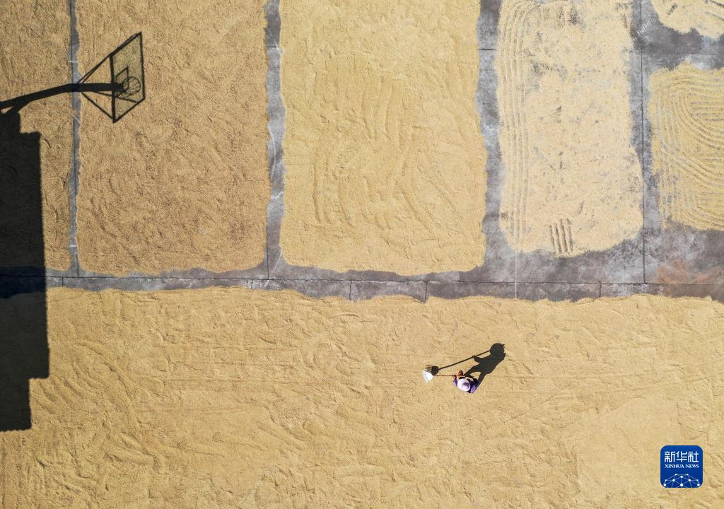 10月24日,廣西貴港市港北區大圩鎮村民在晾曬稻谷(無(wú)人機照片)。