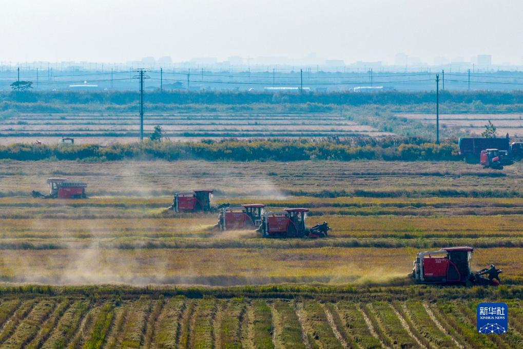 10月24日,收割機在浙江省余姚市濱?,F代農業(yè)先導區收割晚稻(無(wú)人機照片)。