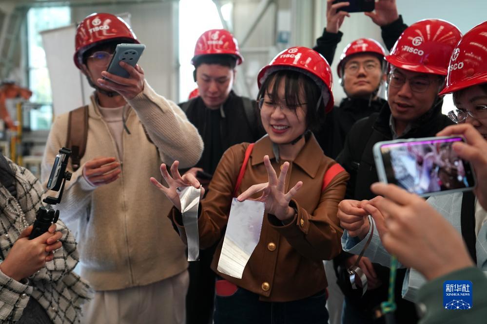 10月24日,參觀(guān)者在中國寶武山西太鋼不銹鋼精密帶鋼有限公司車(chē)間展示“手撕鋼”。