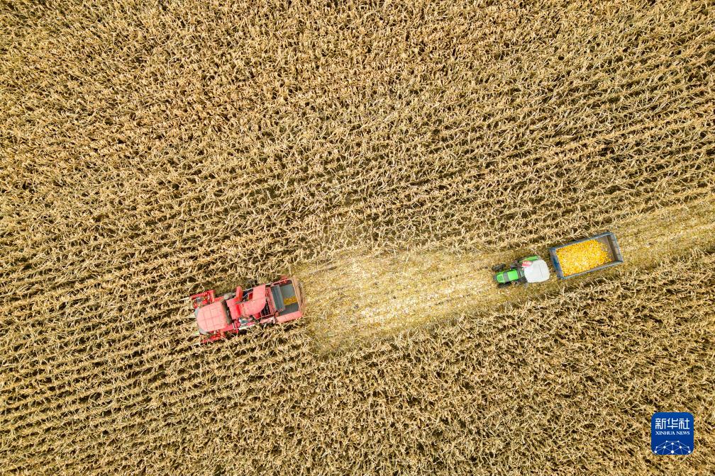 10月18日,收割機在黑龍江省綏化市北林區張維鎮潤地農業(yè)種植合作社的一處玉米地收獲玉米(無(wú)人機照片)。