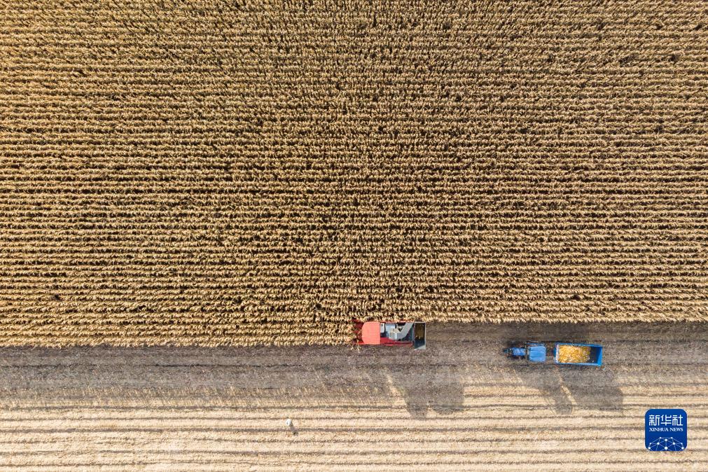 10月19日,在黑龍江省肇東市五里明鎮東升村,農民駕駛收割機在收獲玉米(無(wú)人機照片)。