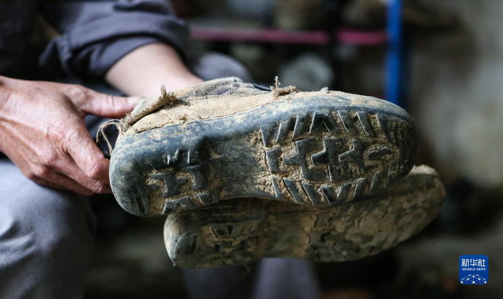 10月18日,海南長(cháng)臂猿監測隊隊員李文永展示一雙因長(cháng)期上山而穿爛的鞋。