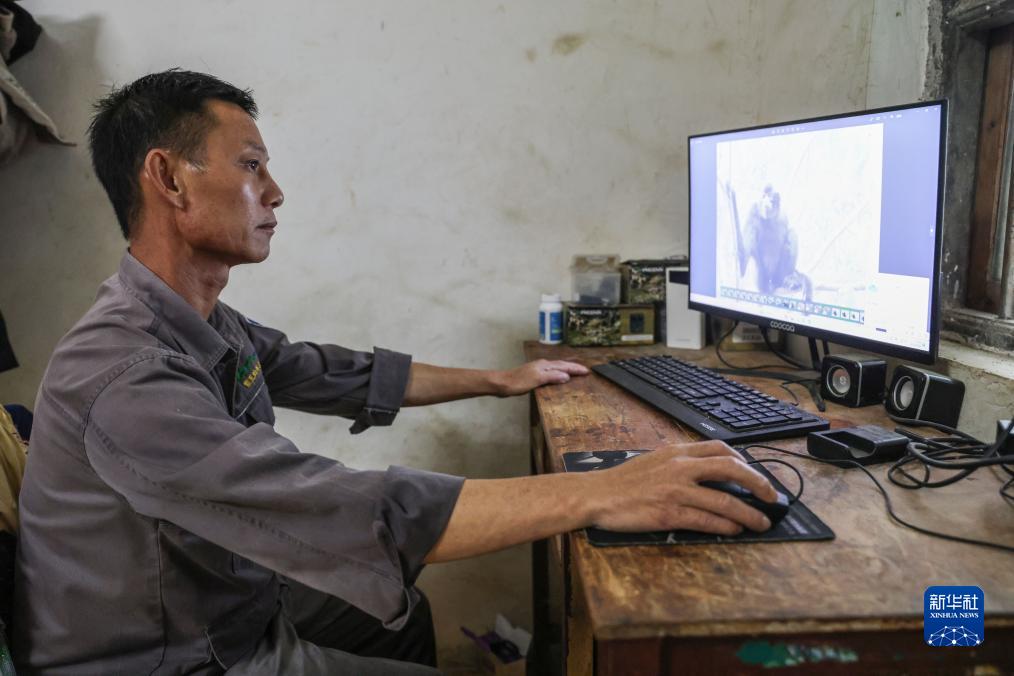 10月18日,海南長(cháng)臂猿監測隊隊員李文永在家中查看拍攝的照片。