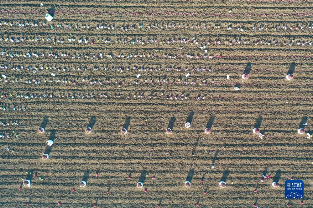 10月24日,寶豐縣周莊鎮西黃村村民在收獲紅薯(無(wú)人機照片)。