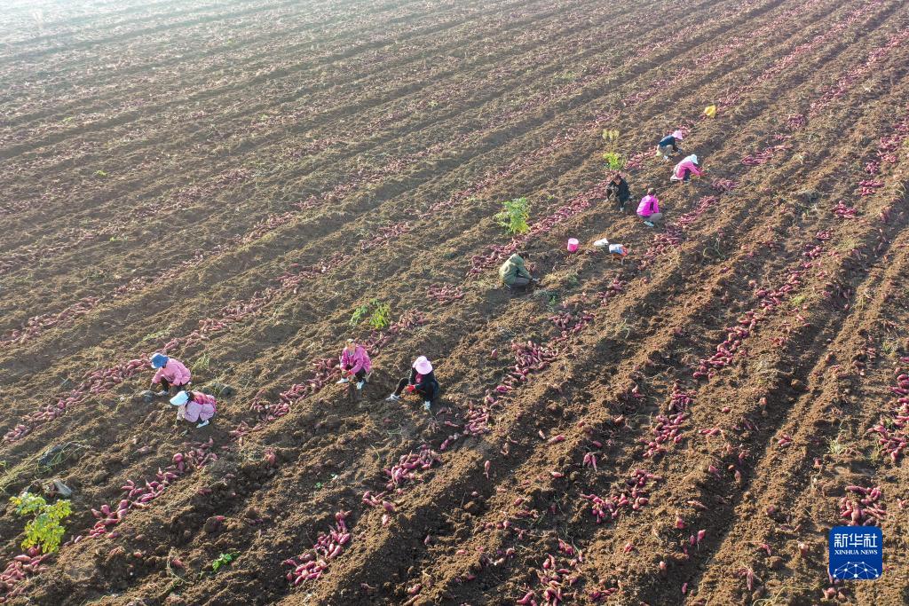 10月24日,寶豐縣周莊鎮西黃村村民在收獲紅薯(無(wú)人機照片)。
