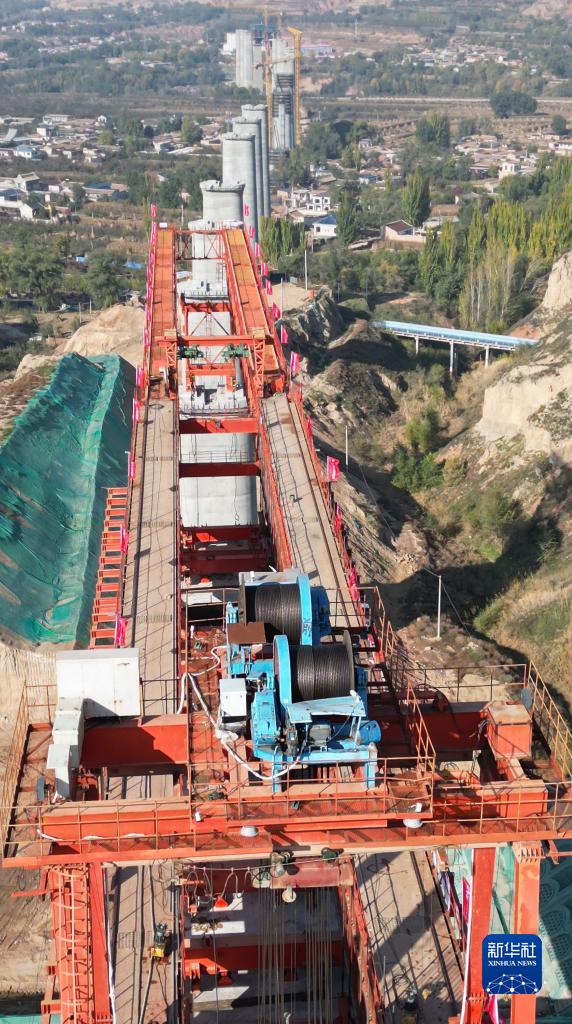 10月24日拍攝的位于甘肅臨夏境內的蘭合鐵路4標段泄湖峽大夏河特大橋膠拼梁架設施工現場(chǎng)(無(wú)人機照片)。