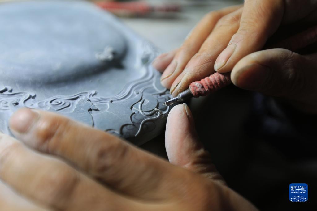 10月24日,藝人在甘肅省定西市臨洮縣洮硯藝術(shù)館雕刻制作洮硯。